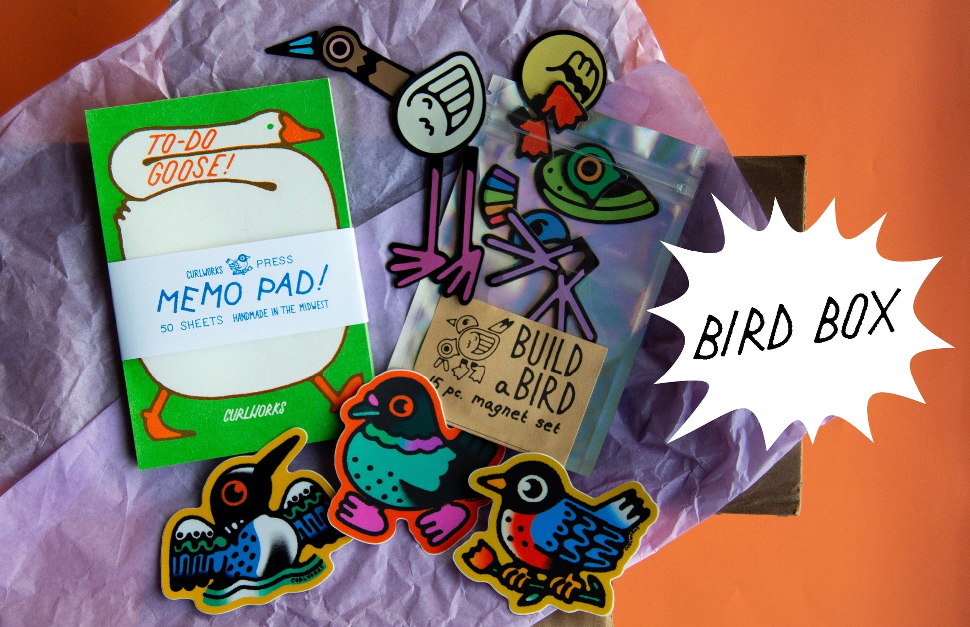 Box includes: To-Do Goose Memo Pad, Build-a-Bird Magnet Set, Pigeon, Loon and Robin Stickers!