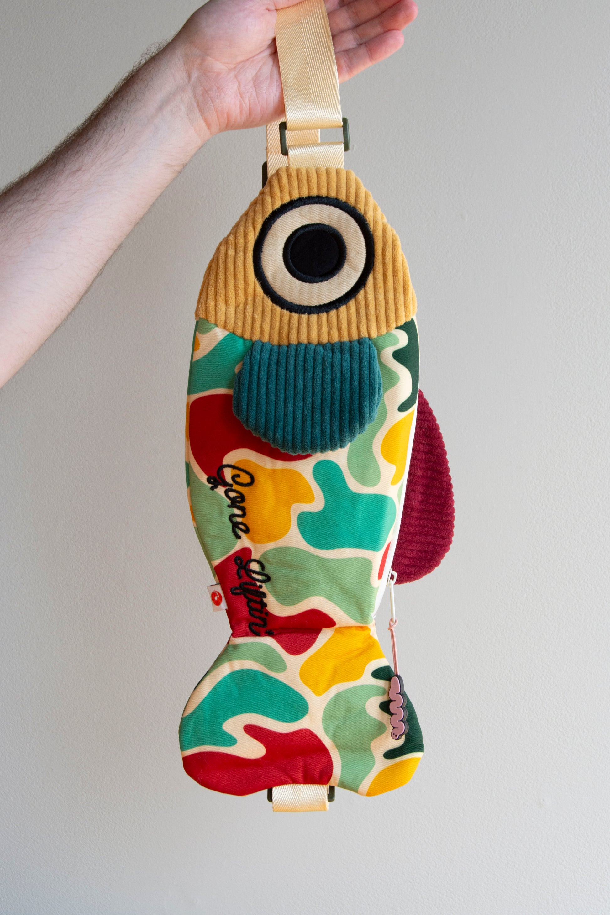He's 17" x 6.75" and comes with a PVC zipper pull, D-ring and buckle matched to the adjustable 1.5" wide nylon strap. The strap can be adjusted to be between ~36" - 80" long (91cm x 203cm) (including the length of the bag) with the included strap-extender. He can be worn as a crossbody or a (large) fanny pack. The body of the fish is printed cotton fabric with corduroy fins.