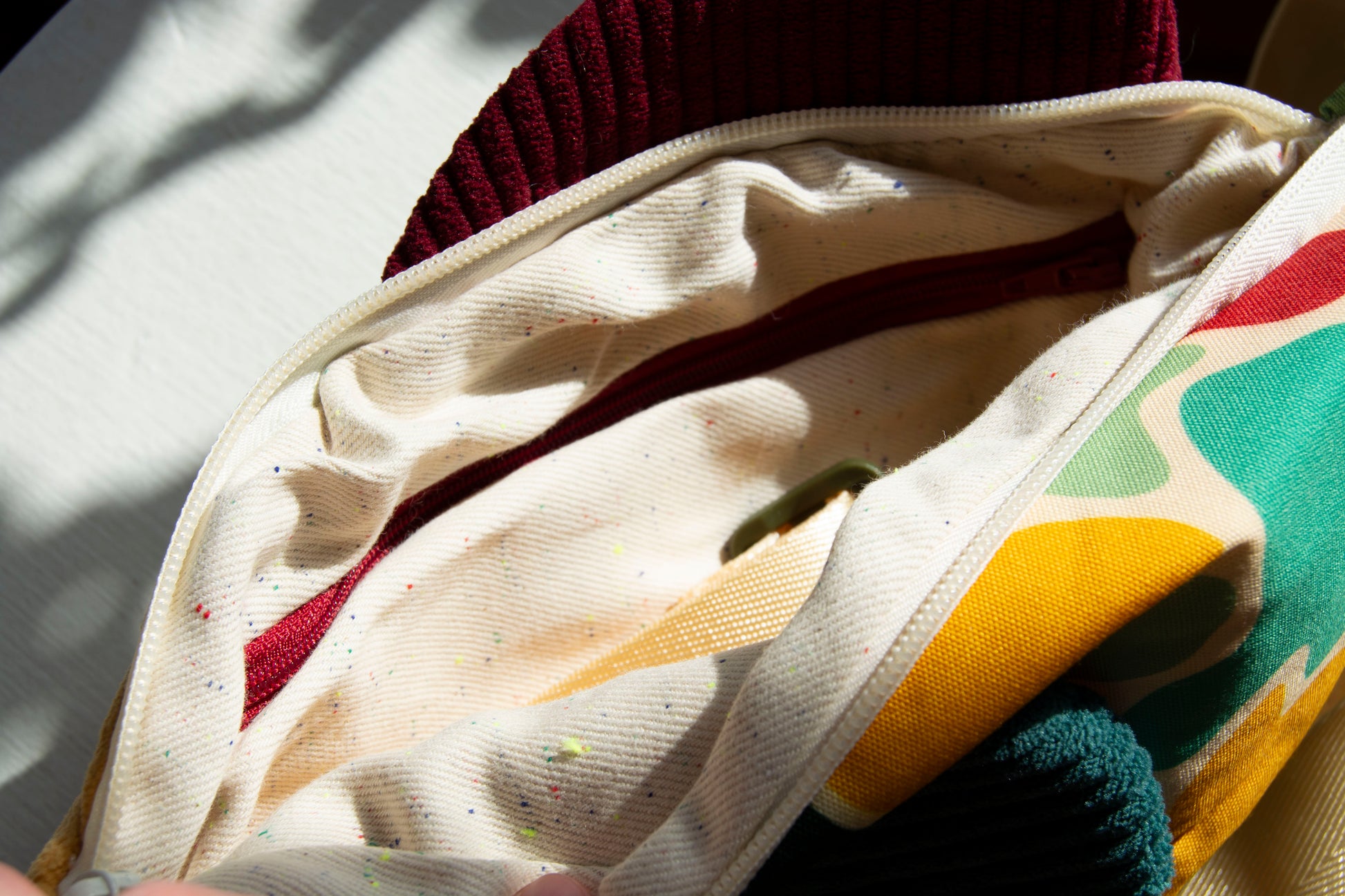 The large main pocket extends the entire length of the fish and is big enough for a standard sized water bottle, Nintendo Switch, or small journal. A smaller interior pocket is great for your wallet, phone, or your pencils and pens. Want to know if something specific will fit in this bag? Reach out!